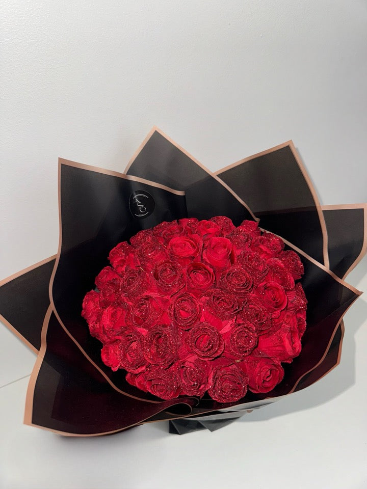 Looking for a unique gift that will capture the heart of your loved one? Look no further than our 50 Glitter Rose Bouquet! This marvelous bouquet is handmade, featuring 50 faux roses that have been delicately coated with a shimmering layer of glitter.